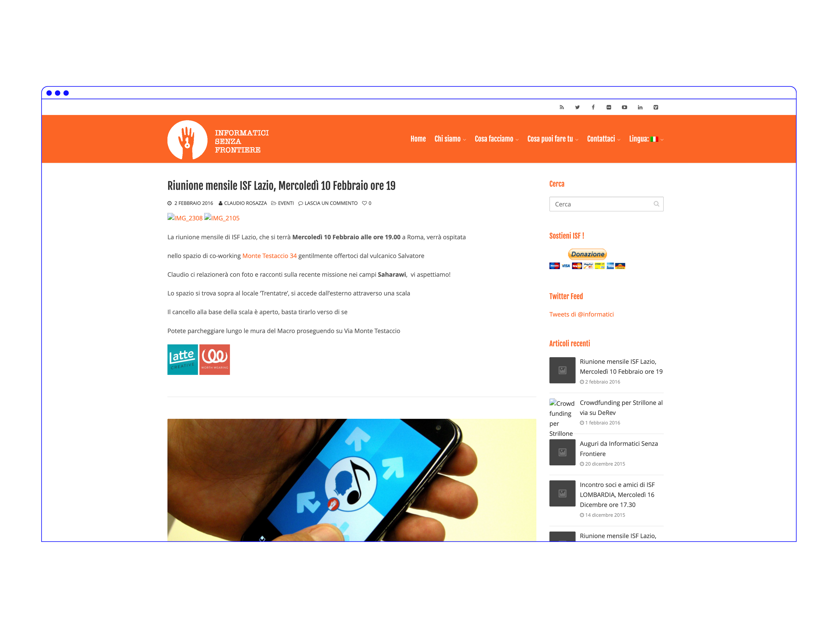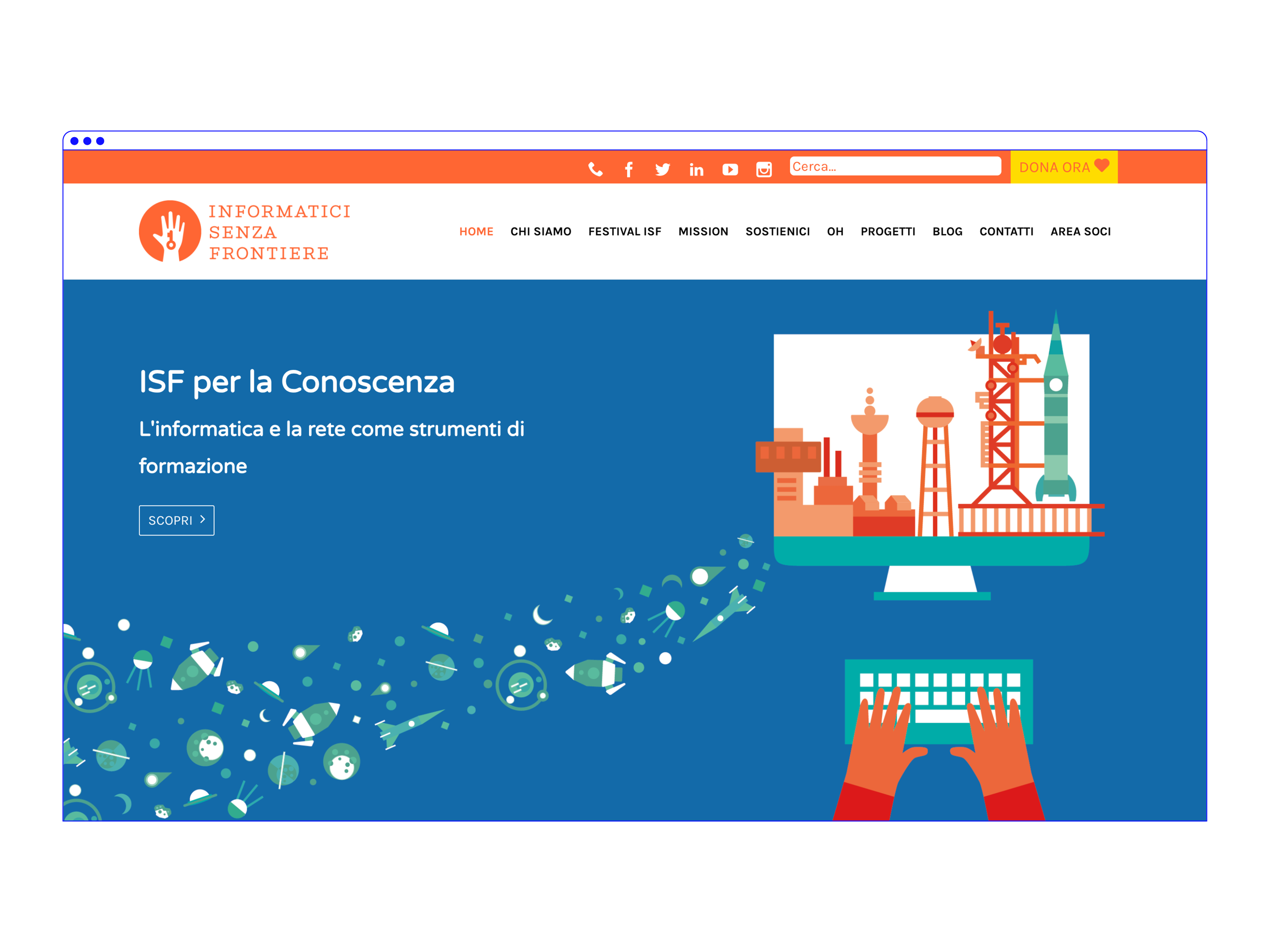 La nuova immagine si è sviluppata in continuità con la precedente andando a ridefinire l'identità visiva a partire da un nuovo impianto tipografico, sviluppato ad hoc per quanto riguarda il logotipo, un soft re-design del marchio e una nuova architettura dell'informazione per mettere al centro la mission e dare valore al lavoro di Informatici Senza Frontiere.